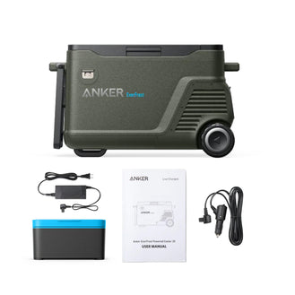 Anker EverFrost Powered Cooler 33L, 299Wh battery, 95W charger, car charging cable, user manual.