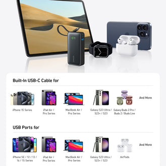 Use the integrated USB-C cable to charge your phones, tablets, and laptops, as well as recharge the power bank, meeting all your charging needs.