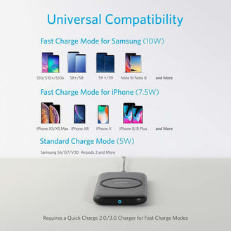 A Quick Charge 2.0 or 3.0 wall charger is required for fast charging. The standard charge mode also requires at least 5V/2A. iPhone stock chargers are not compatible with PowerWave Base Pad. Note: Please use the included cable for best results.