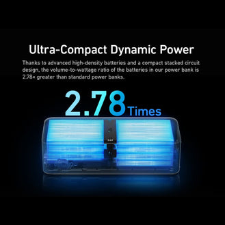 Our power bank combines advanced high-density batteries and a compact stacked circuit design. Its volume-to-density ratio is 2.78 time higher than standard power banks.