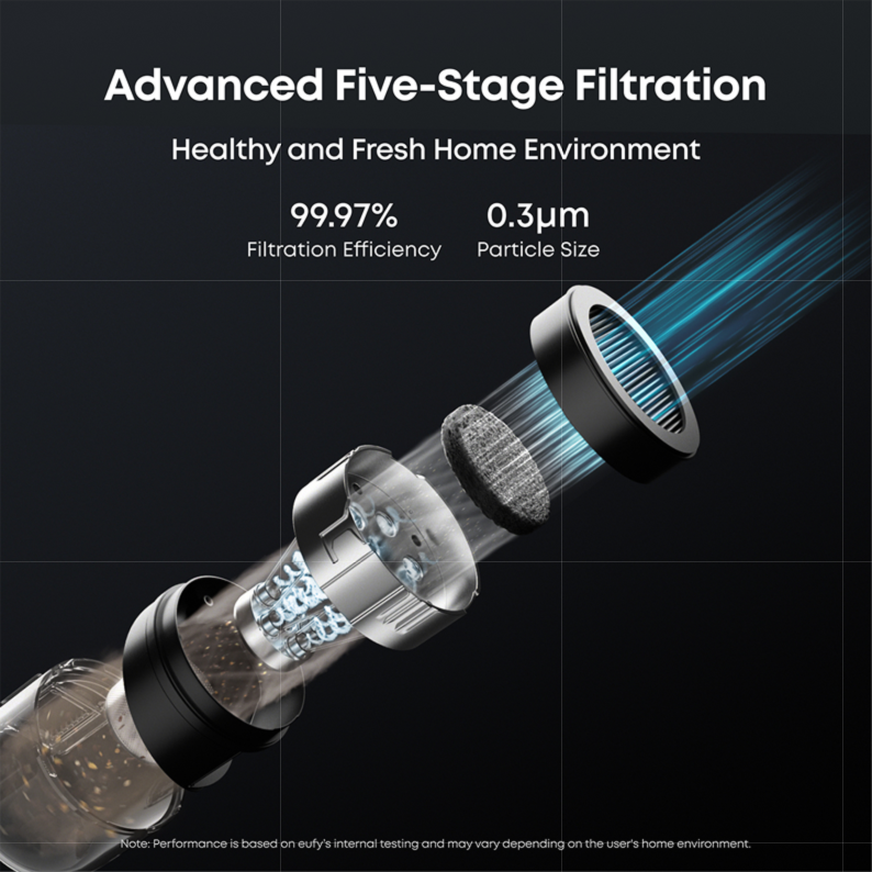 The advanced five-stage filtration system captures 99.97%* of particles as small as 0.3 Microns for a healthier home.