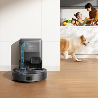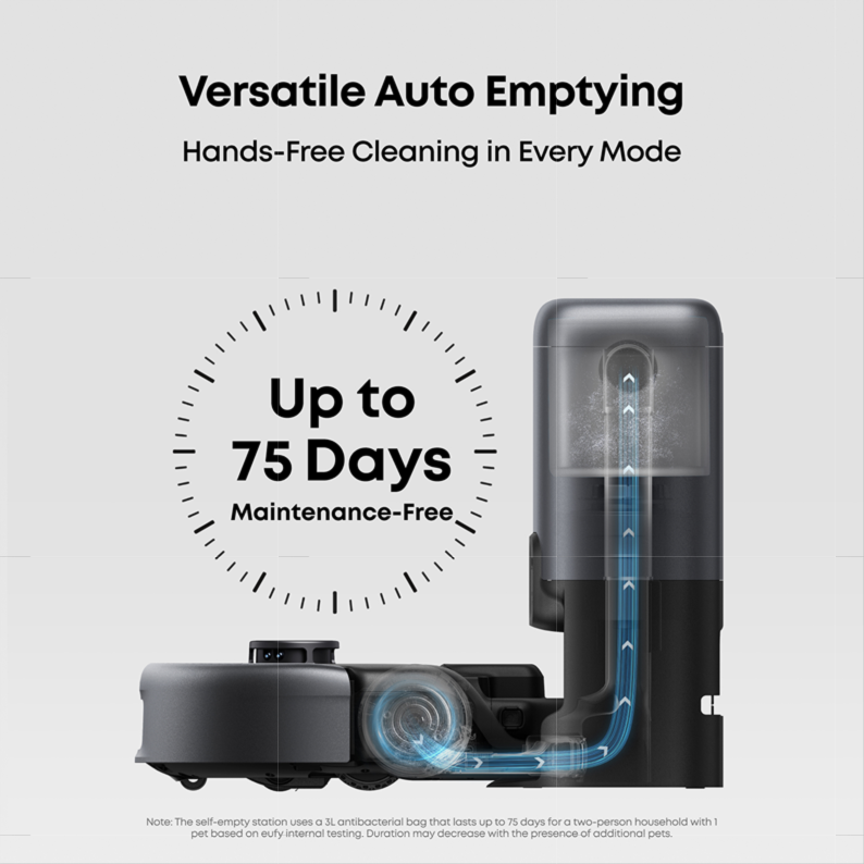 Note: The self-empty station uses a 3L antibacterial bag that lasts up to 75 days for a two-person household with pets. Duration may decrease with the presence of pets.
