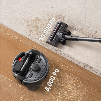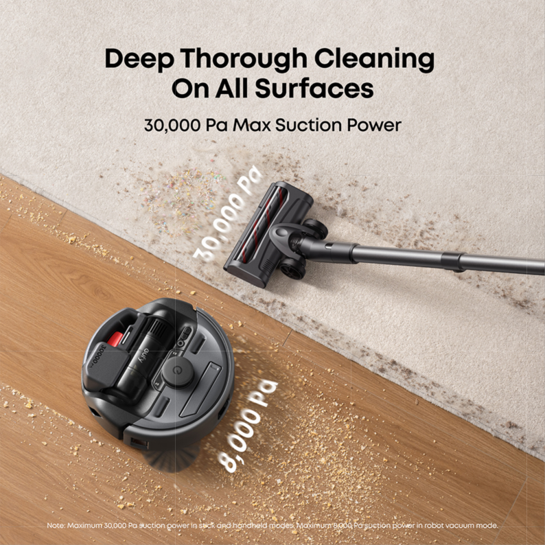 With a maximum suction power of 30,000Pa in vacuum mode and 8,000Pa in robot mode, this device ensures effective dirt and debris removal across various surfaces.