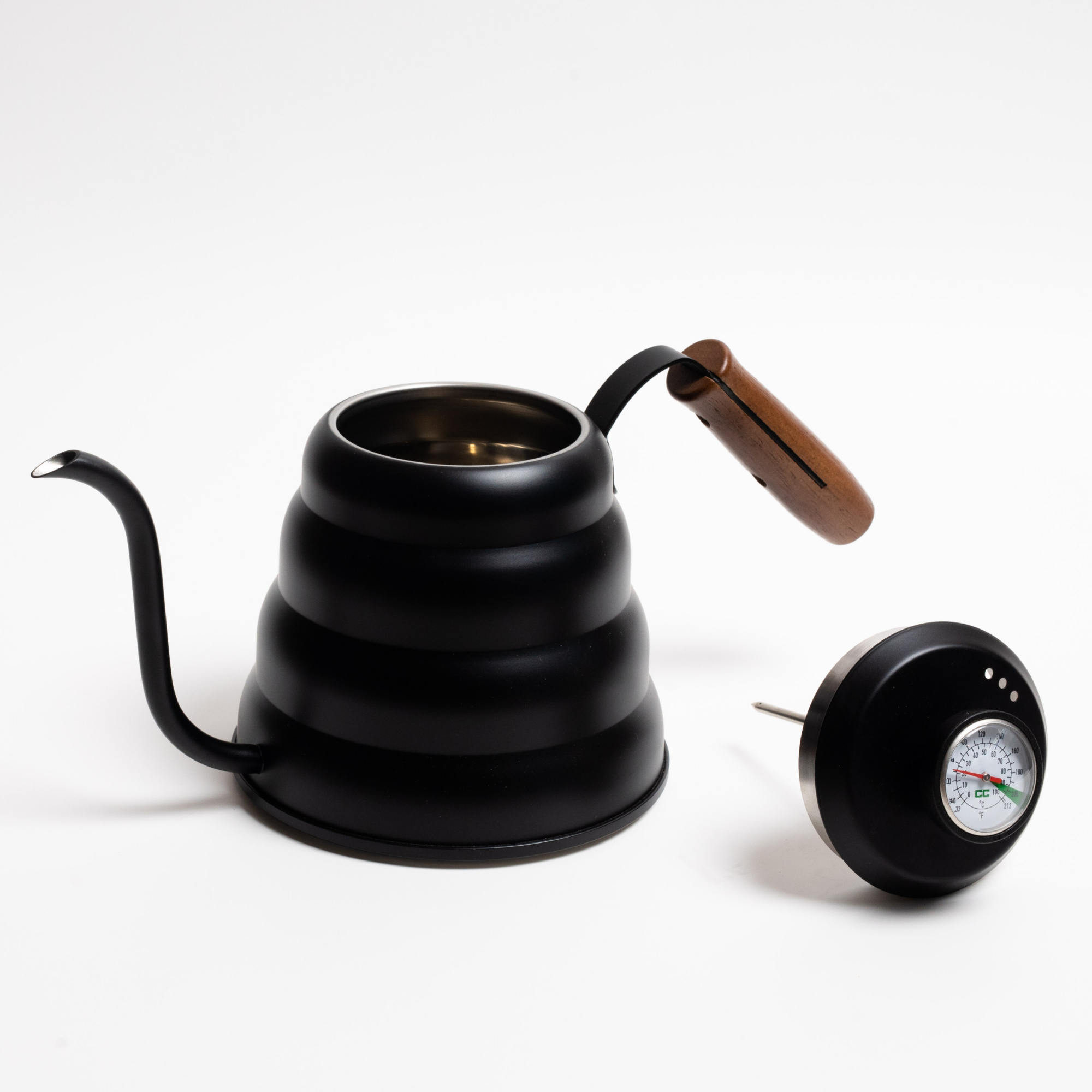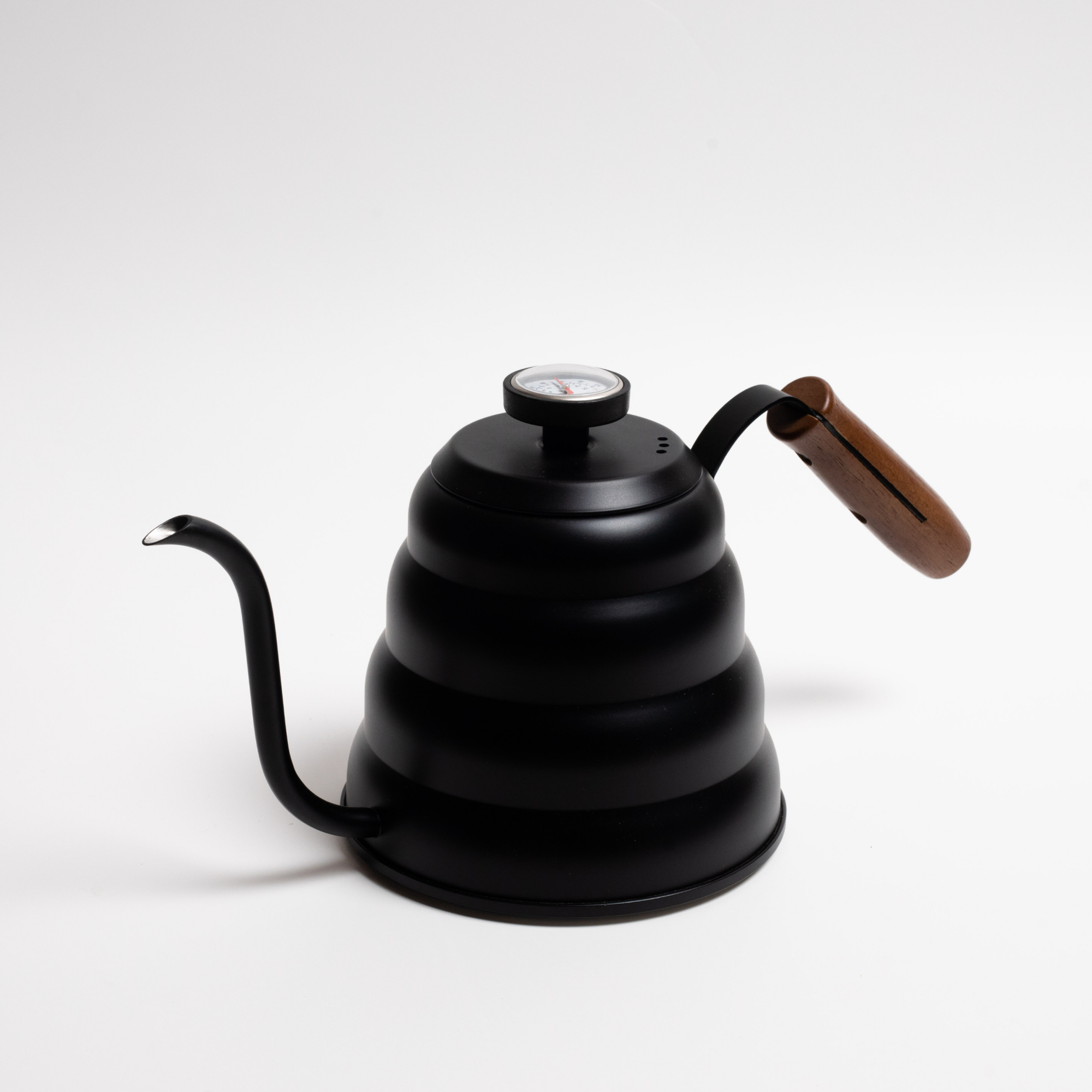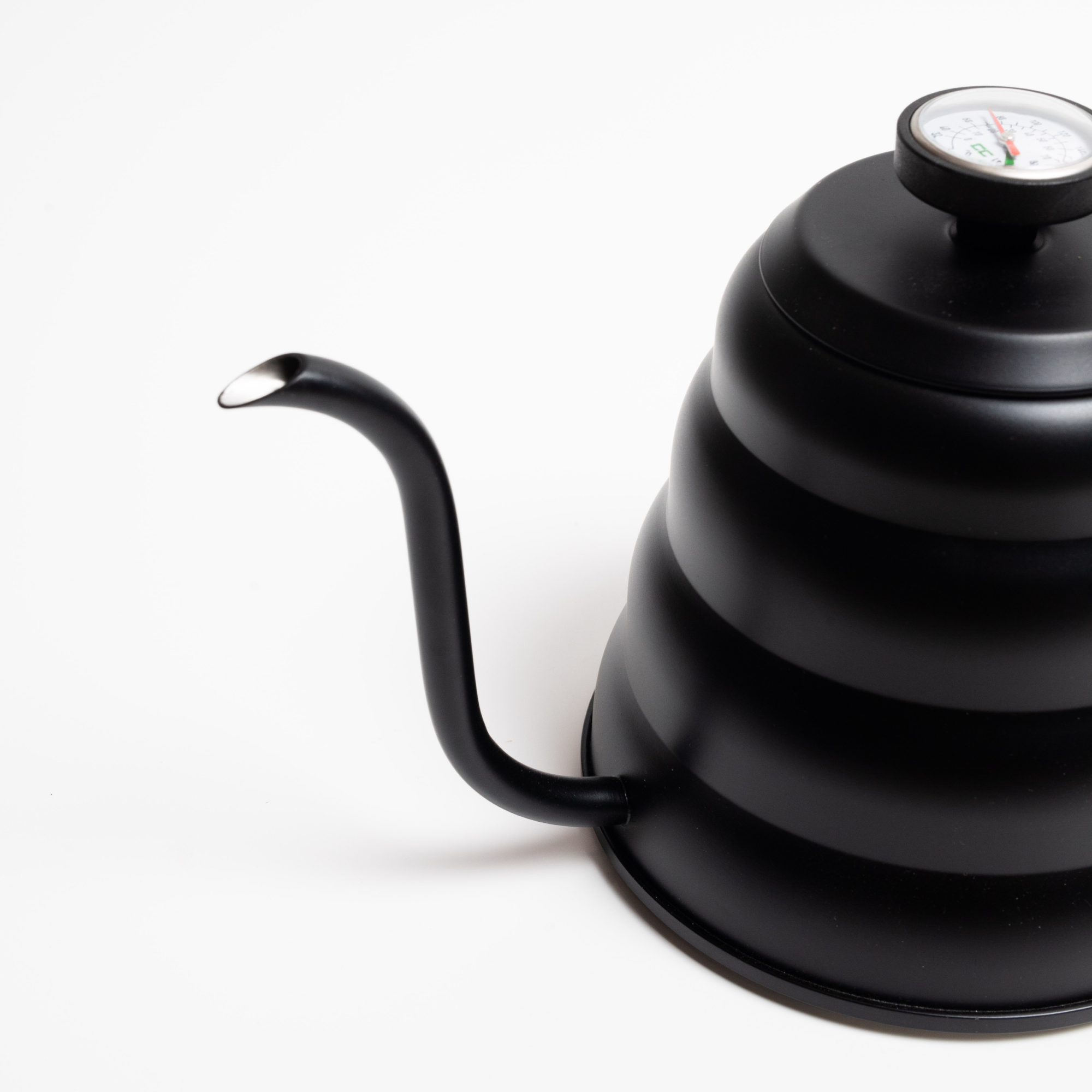 Matte black goose neck kettle with built in thermometer to help monitor the perfect water temperature for tea or coffee.