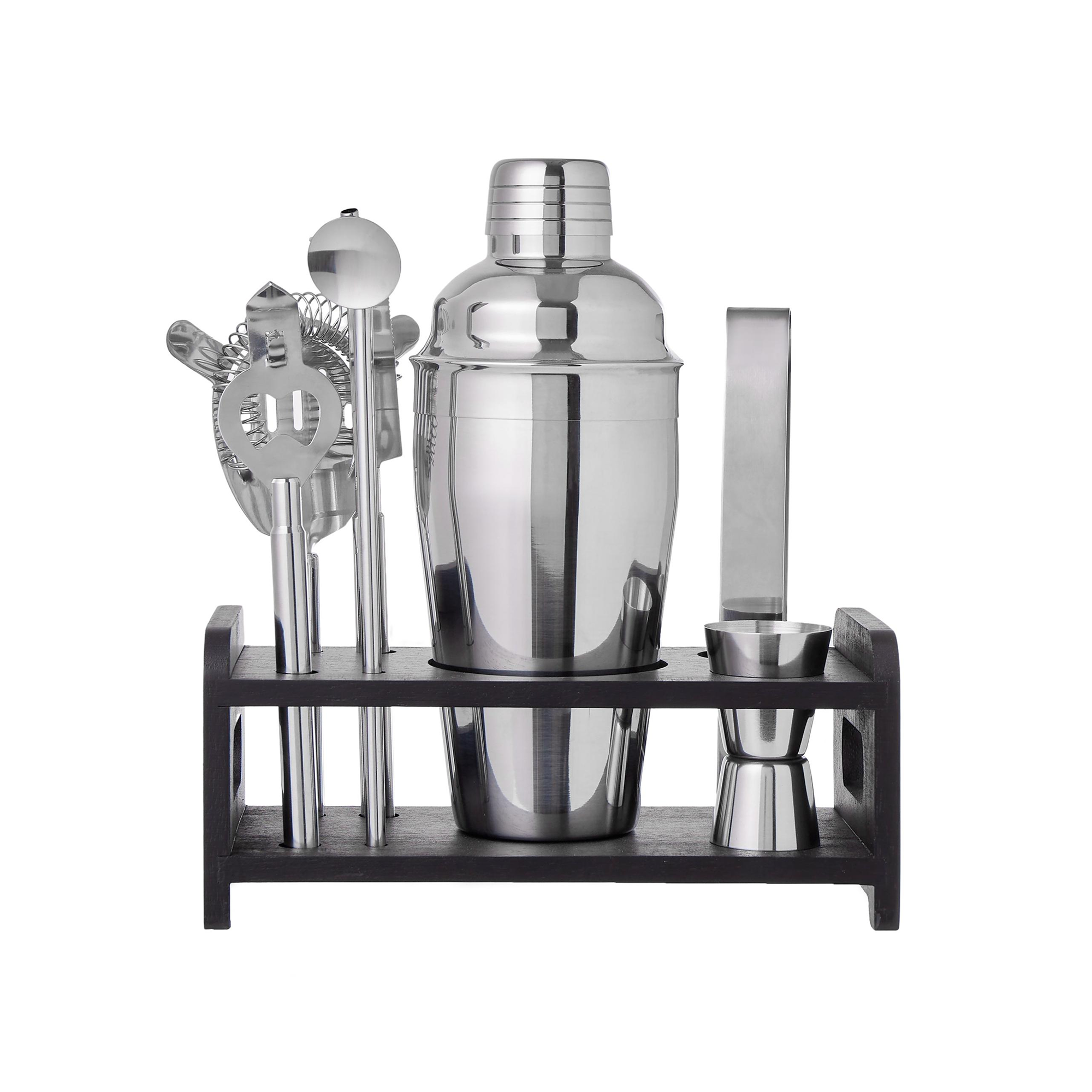 It includes a shaker, stirring spoon, fruit knife, tongs, strainer, double jigger, bottle opener, and acacia wooden stand.