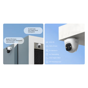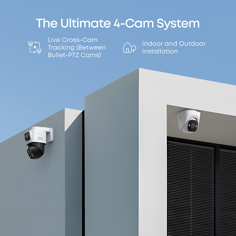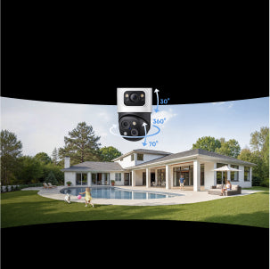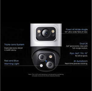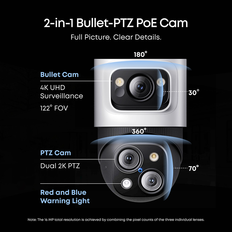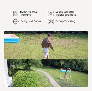 The upper 4K wide-angle camera provides a 122° fixed view of the entire scene, while the lower 2K PTZ camera pans 360° for complete coverage. Bullet-to-PTZ Tracking: When the bullet cam detects a subject, the PTZ locks on and precisely tracks it for continuous monitoring.