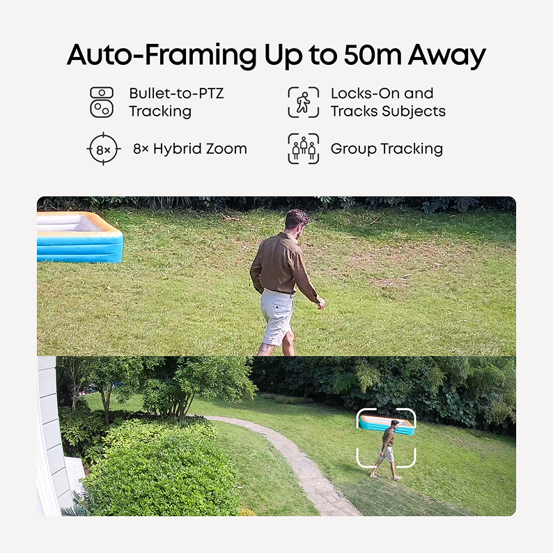 When the upper camera detects a subject, the lower PTZ camera locks on, automatically tracking and framing them with sharp, centered close-ups and 8× auto zoom—even from 50m away. Group Tracking: Automatically adjusts zoom to keep all subjects in frame, even if they move, until one exits the field of view.