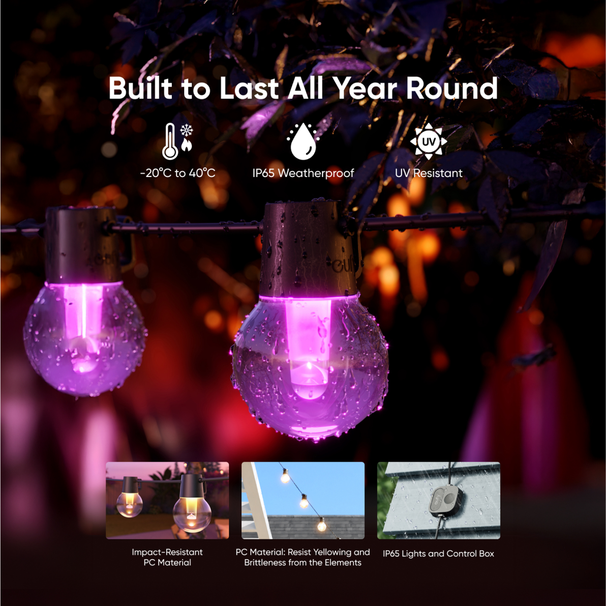 Designed for outdoor use, the lights are made from UV-resistant material and have an IP65 rating to protect against water and dust. Operates in temperatures from -20°C to 40°C (-4°F to 104°F) for up to 50,000 hours.