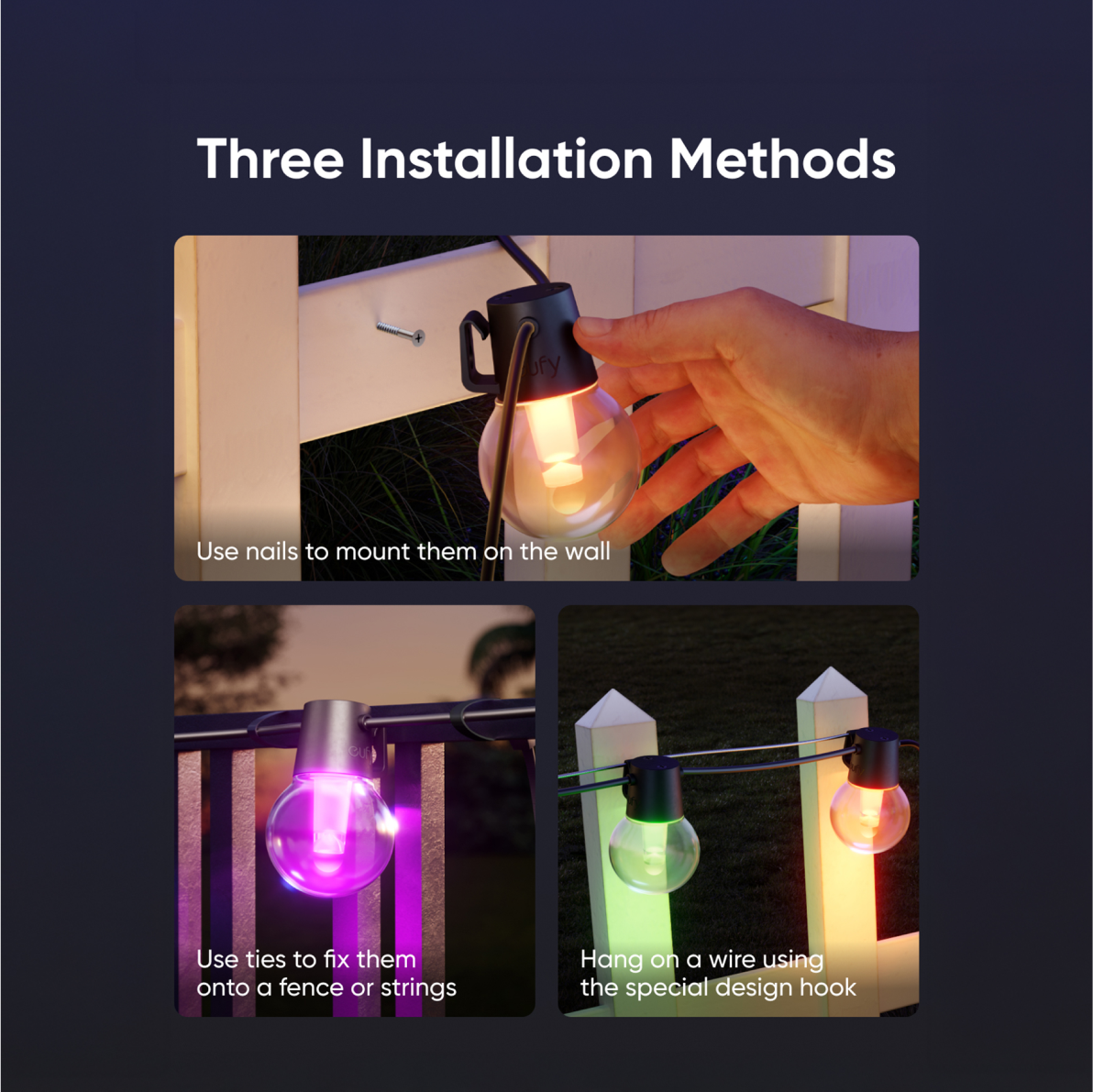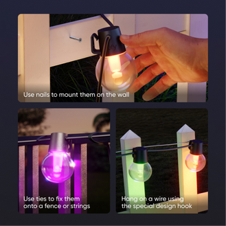 For secure mounting use nails to mount them on the wall, ties to fix them onto a fence or strings or the specially designed hook to hang them on a wire.