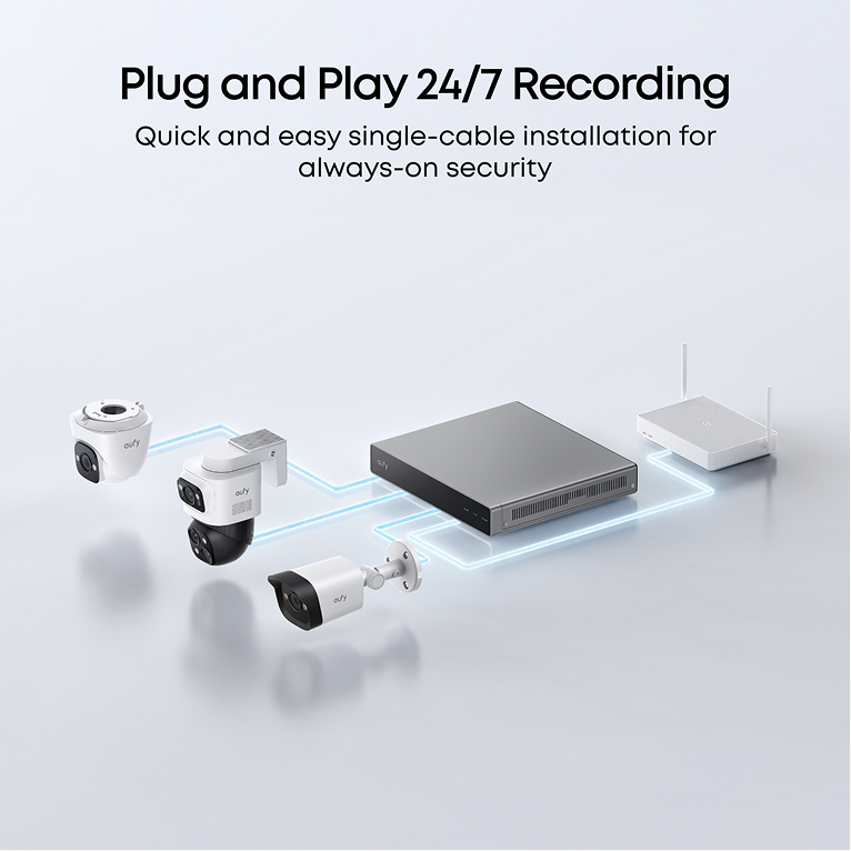 Avoid complex wiring and use a single cable to connect your eufy PoE cameras to a network video recorder for power and video.
