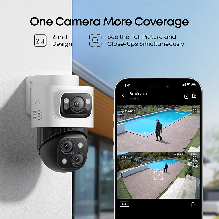The upper 4K wide-angle camera provides a 122° fixed view of the entire scene, while the lower 2K PTZ camera pans 360° for complete coverage. Bullet-to-PTZ Tracking: When the bullet cam detects a subject, the PTZ locks on and precisely tracks it for continuous monitoring.