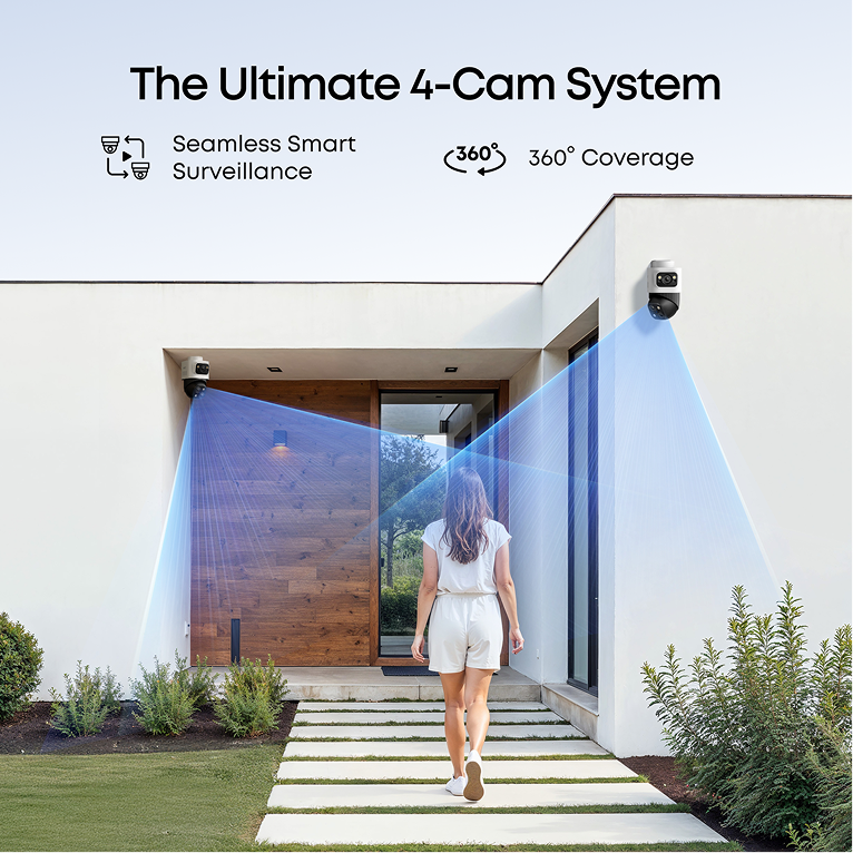Triple-Lens System: Captures every detail in 16MP clarity. Fixed 4K Wide-Angle, 122° ultra-wide field of view. Dual 2K PTZ, 360° panoramic view with full-range motion. 360° Pan, 70° Tilt, No blind spots. 8× Optical Auto-Zoom, Real-time precise tracking. Note: The 16 MP total resolution is achieved by combining the pixel counts of the three individual lenses.