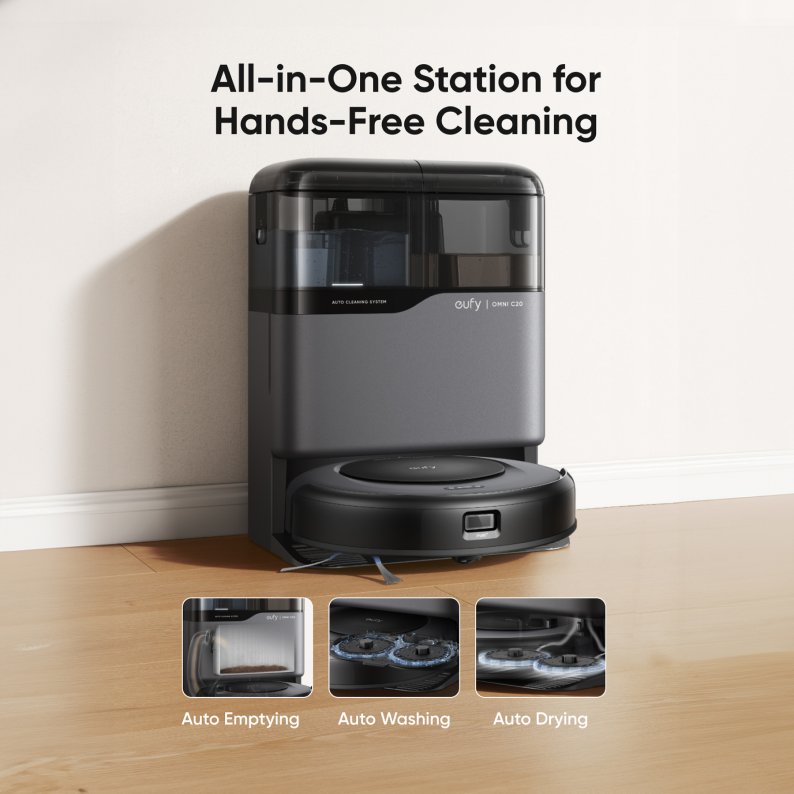 Omni C20’s All-in-One Station provides fully automated cleaning, ensuring a spotless home with minimal effort.