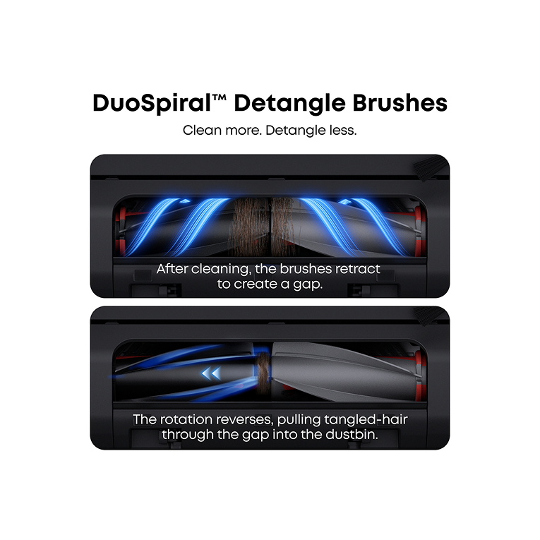 DuoSpiral Brushes prevent hair entanglement and reduce maintenance frequency, providing a hassle-free cleaning experience.
