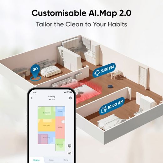 Select specific rooms to clean, set up No-Go Zones, adjust clean patterns, and use Multi-Floor Mapping for homes with two or more floors.