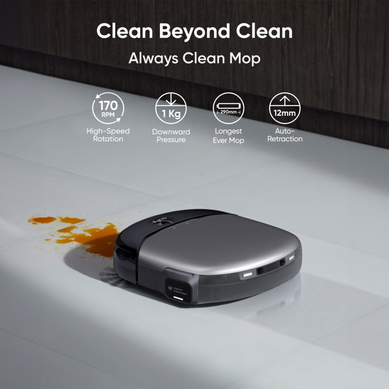 Introducing the Always Clean Mop with a dual water reservoir that refreshes the mop in real-time at 170RPM, ensuring all-around* cleanliness by removing even invisible dirt. *Actual performance may vary based on the floor type and dust level.