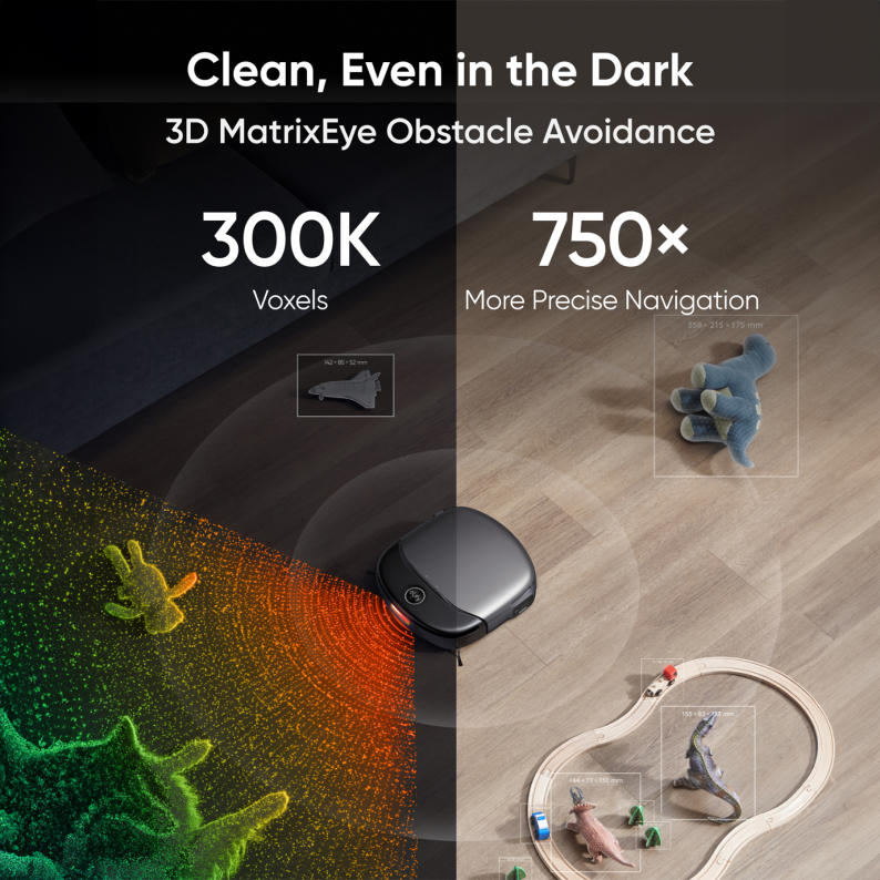Effortlessly navigates around obstacles* or varying shapes and sizes, including moving objects and small items like toys, ensuring a smooth cleaning experience. *Based on eufy internal tests, under low light settings, the recognition ability of cables and fabrics may vary. Actual results may vary depending on the environment.