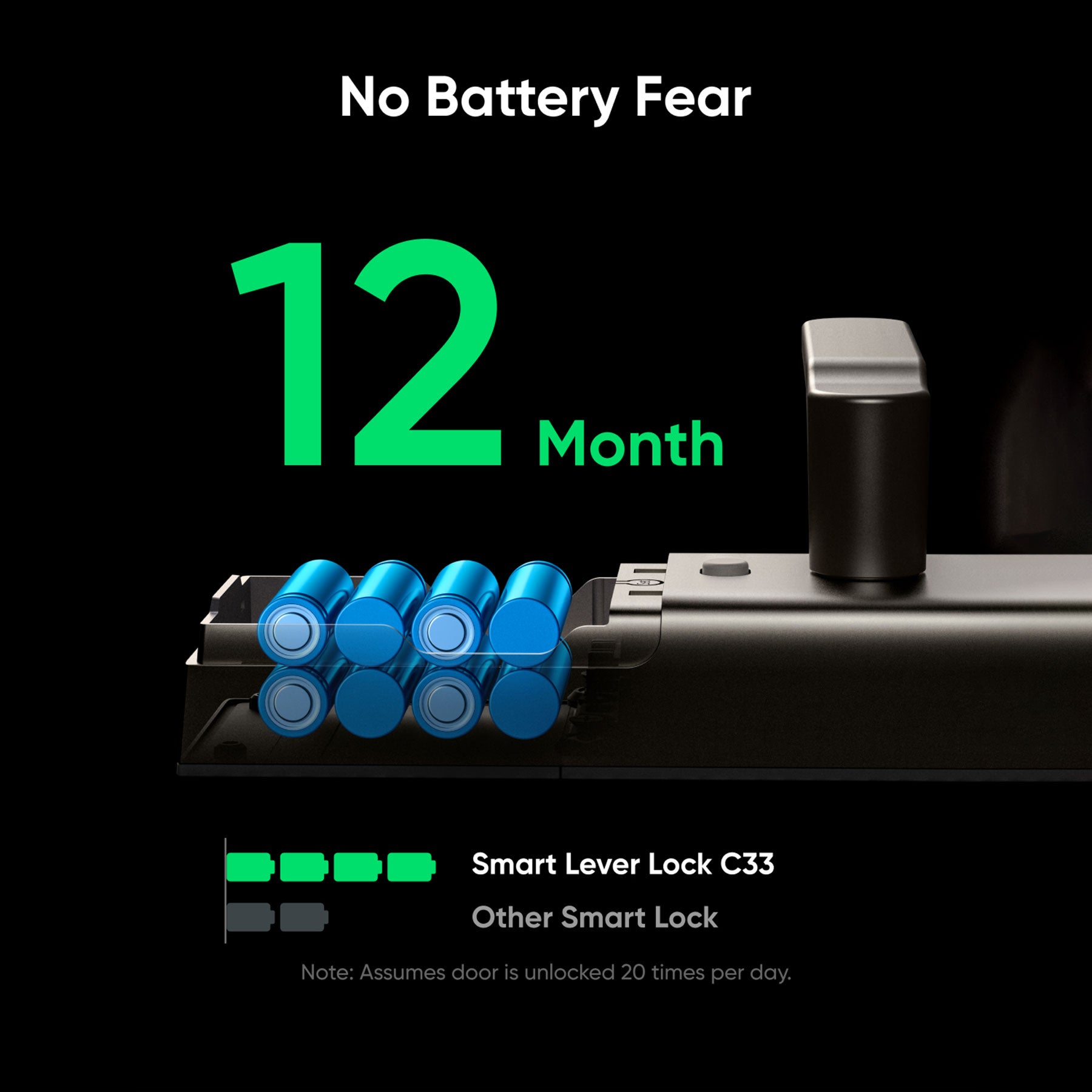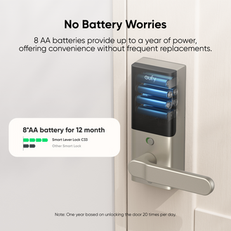 • No Battery Worries with 12-Month Power: Enjoy peace of mind with the eufy Smart Lock C33, providing reliable security without the constant need for battery changes. The lock remains operational throughout the year, ensuring continuous protection.