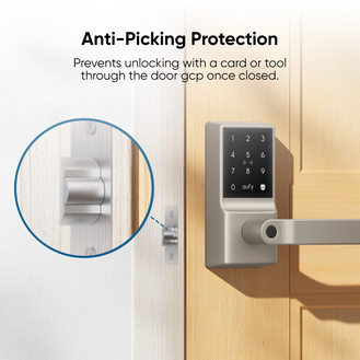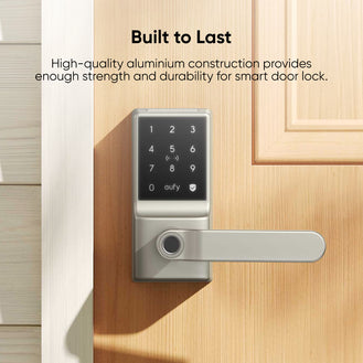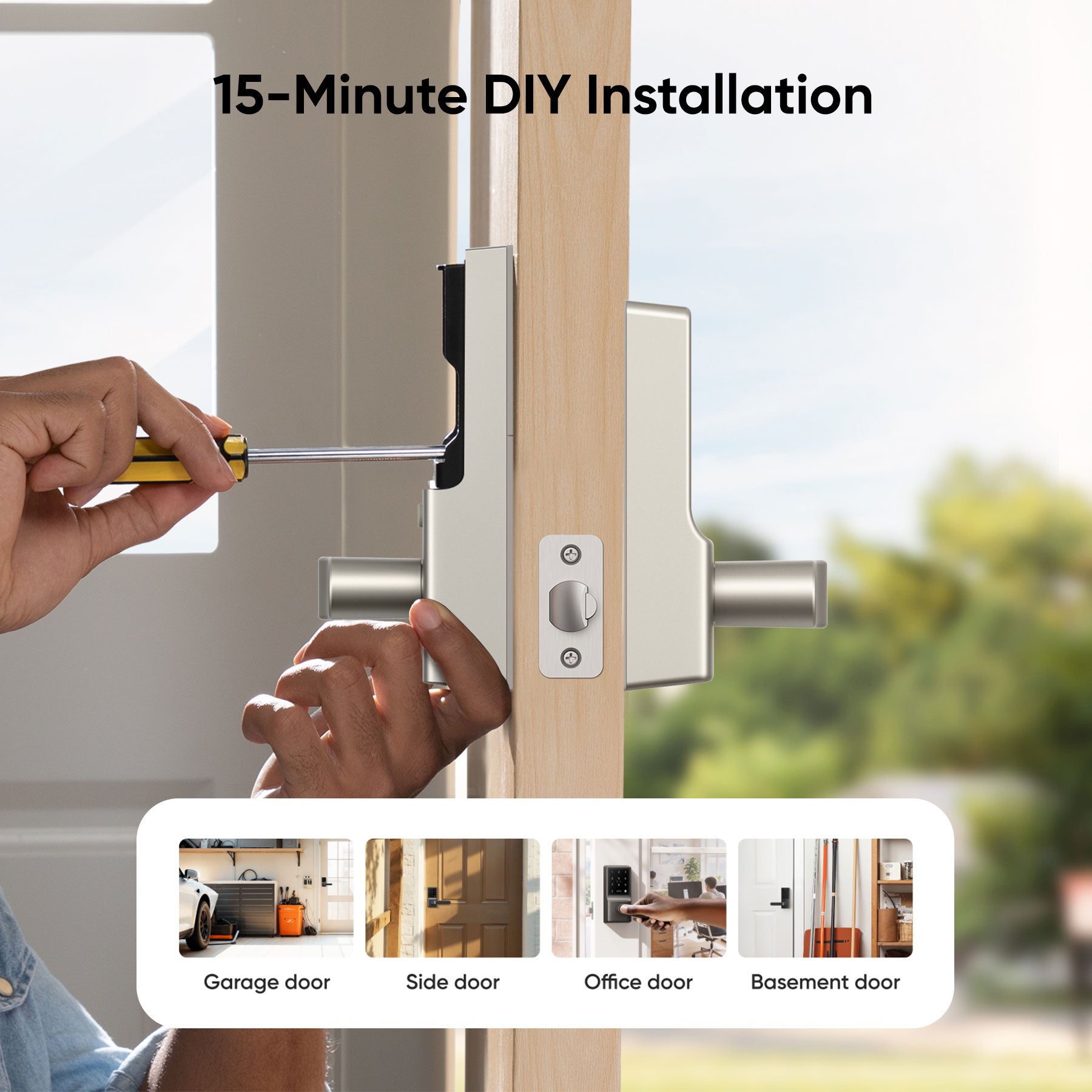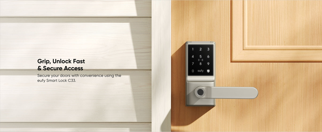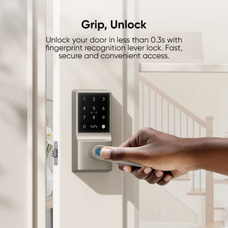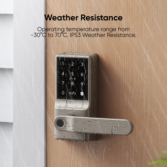 Secure your doors with convenience using the eufy Smart Lock C33, a fingerprint keyless door lock with handle, built-in Wi-Fi, app remote control, biometric door knob for entry doors, auto lock, and IP53 waterproof rating.
