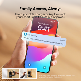 You'll get a low-battery notification when the battery is under 20%. If the battery dies, you can use a portable charger or physical key to unlock your Smart Lock. (Note: The USB-C Port is for emergency power supply only, not for charging the battery.)