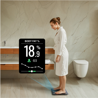Step onto the scale and effortlessly view all your stats at a single glance, no phone required even in the bathroom. Note: It is recommended to place the scale in a relatively dry environment and please ensure feet are dry for accurate measurement.