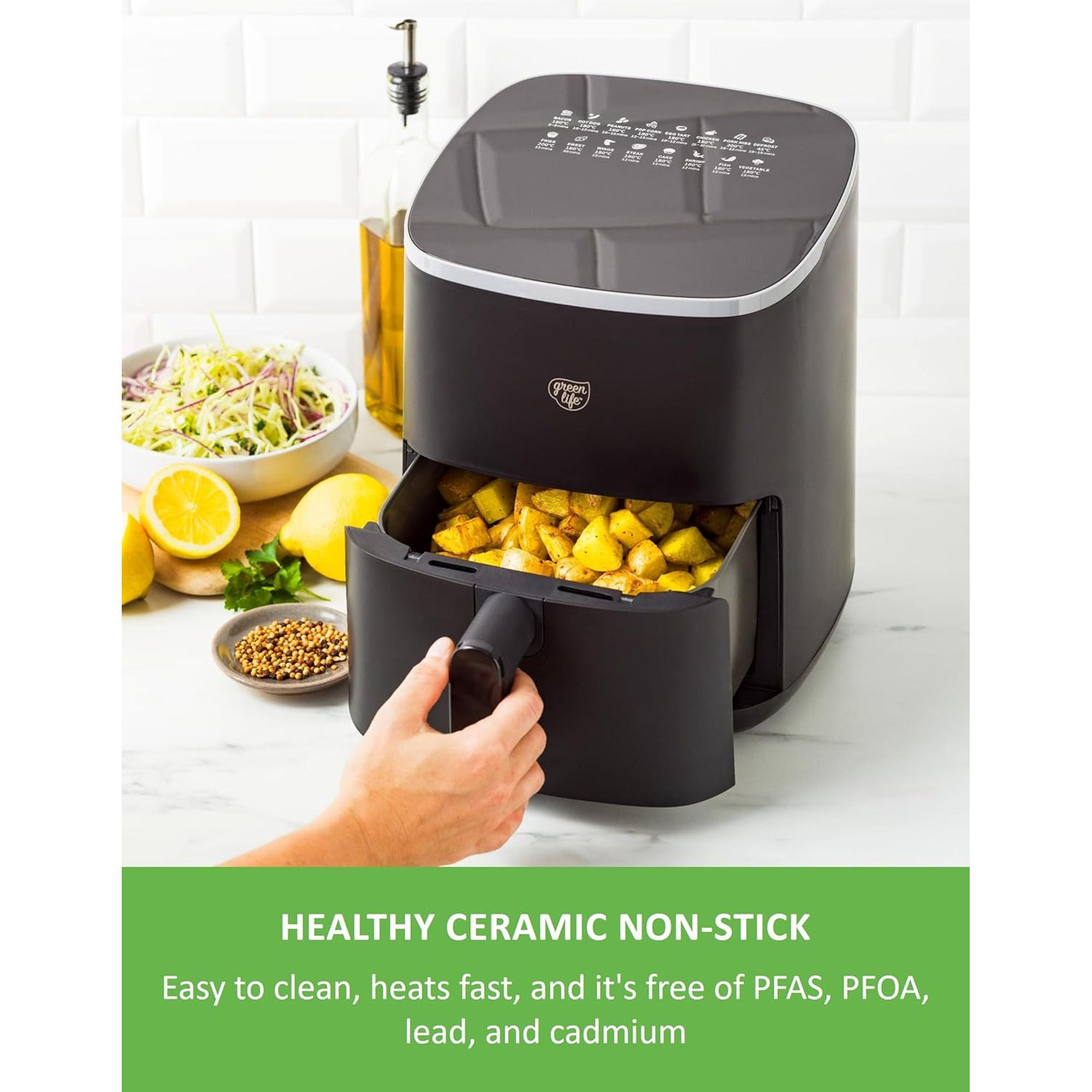 Prepare healthy meals in no- time with GreenLife's 4.7L Air Fryer. With spacious 4.7L capacity and 8 cooking presets- make fries, chicken, chicken wings, steak, fish, meat, vegetables, cake& pastry with a touch of a button. You can always delay the cooking time- set a cooking program to start cooking at later time.