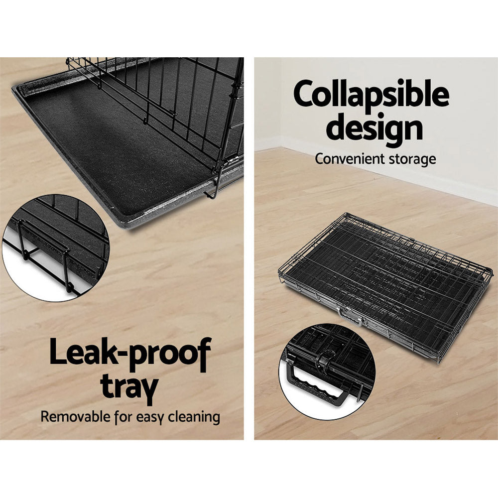 Featuring a foldable design with triple access doors, this dog cage offers maximum convenience and is extremely safe for containing your pets. It's metal constructed with a powder coated finish enhancing durability and is also rust resistant. Easy to setup, store, transport and clean. Great for securely keeping your pets contained, a must have for every pet owner.