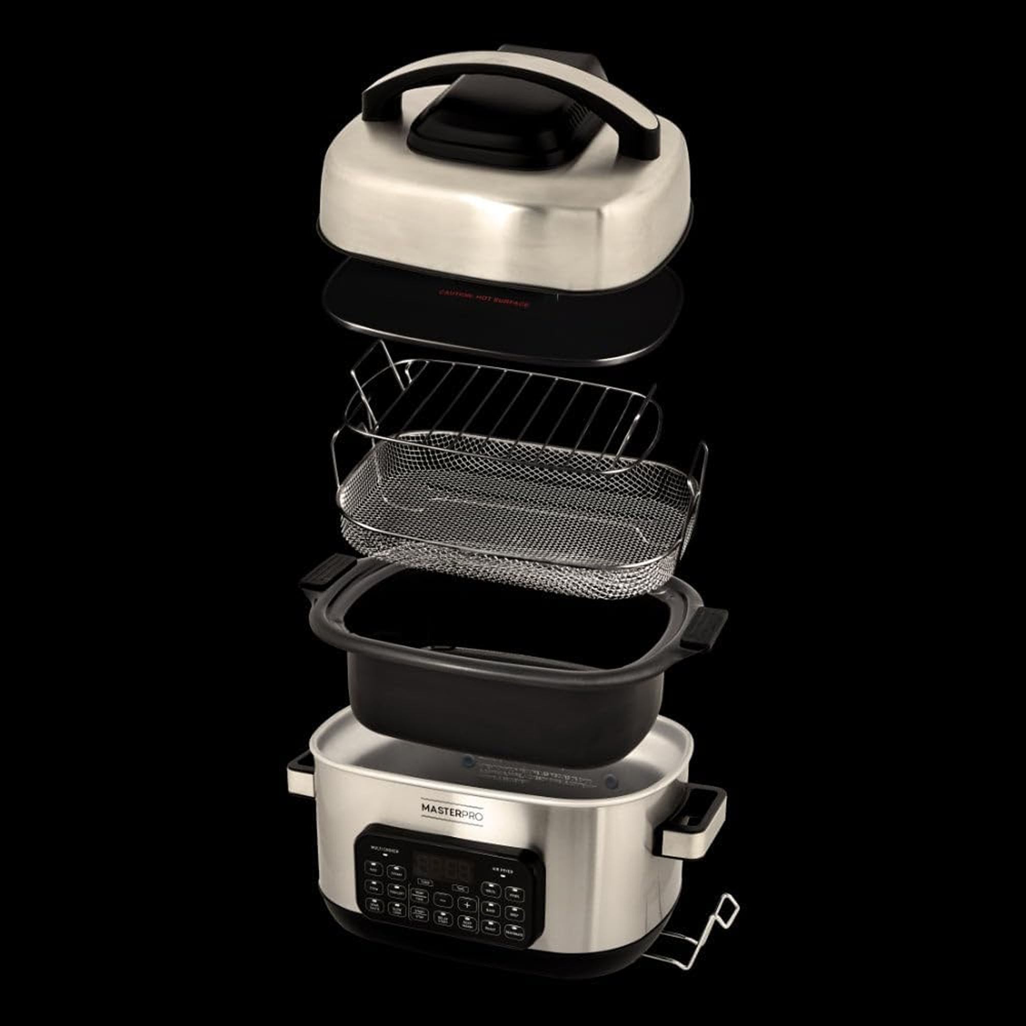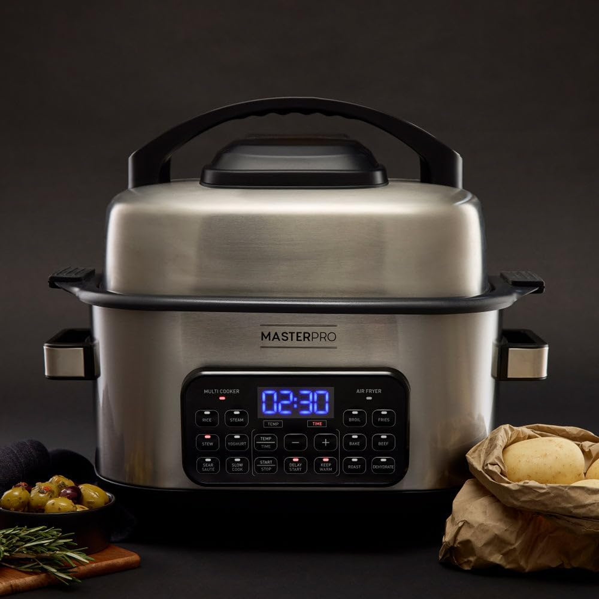MasterPro 14-in-1 Deluxe Multi Cooker Air Fryer is a versatile kitchen appliance designed to simplify meal preparation. With a 6-liter capacity, it's perfect for cooking meals for a family of four or five. This multi cooker features 14 pre-programmed settings, allowing you to effortlessly slow cook, pressure cook, air fry, bake, roast, steam, make yogurt, cake and bread, as well as prepare soup, stew, chili and reheat meals. Its digital LED control panel ensures easy operation, while the easy-to-clean nonstick inner pot adds convenience to your cooking routine. Additional features include a keep warm function and a delay timer, making it a comprehensive solution for all your cooking needs.