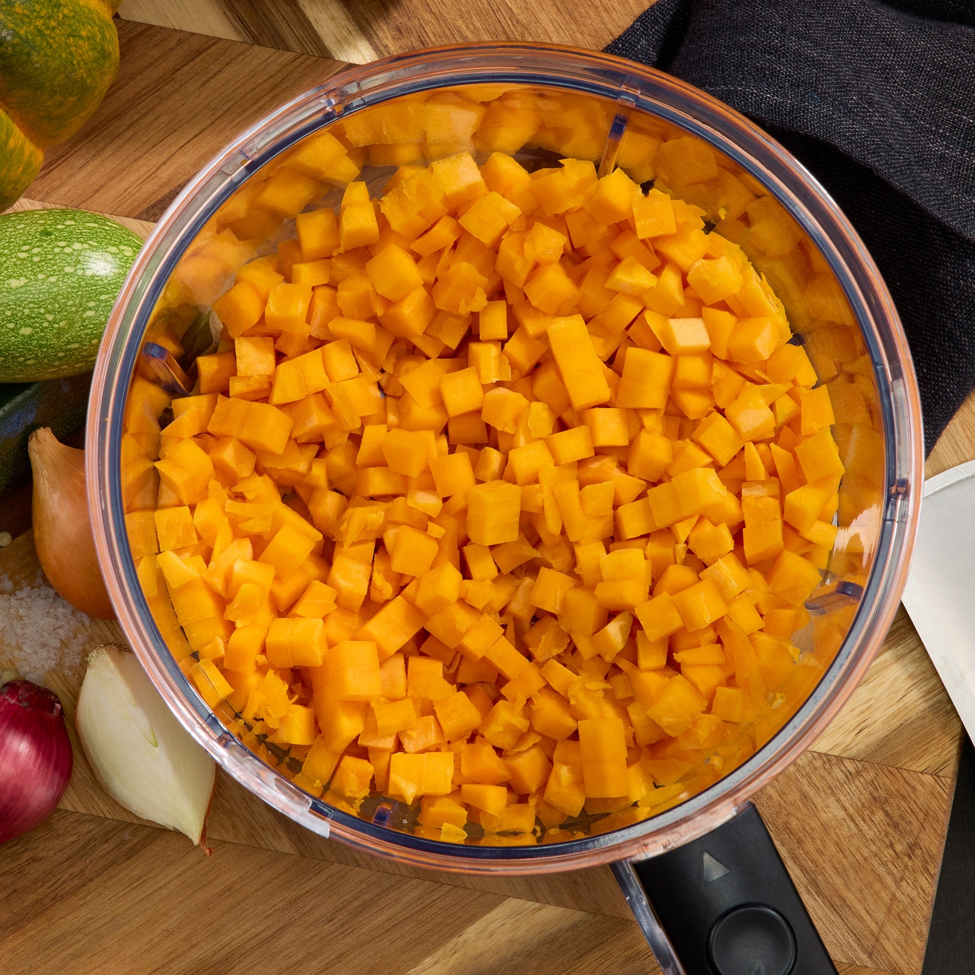 This appliance is ideal for blending soups, smoothies and purees or chopping, slicing and shredding ingredients for meal prep.