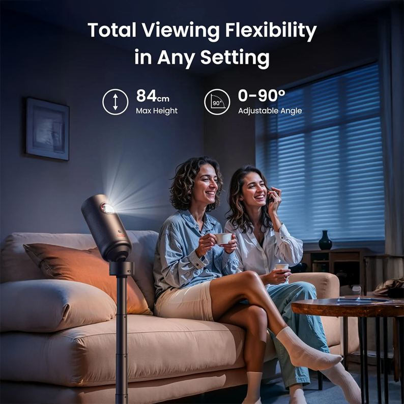 Adjust the projector up to 90° to get the best view. Tripod reaches 84cm max height to work in any room.