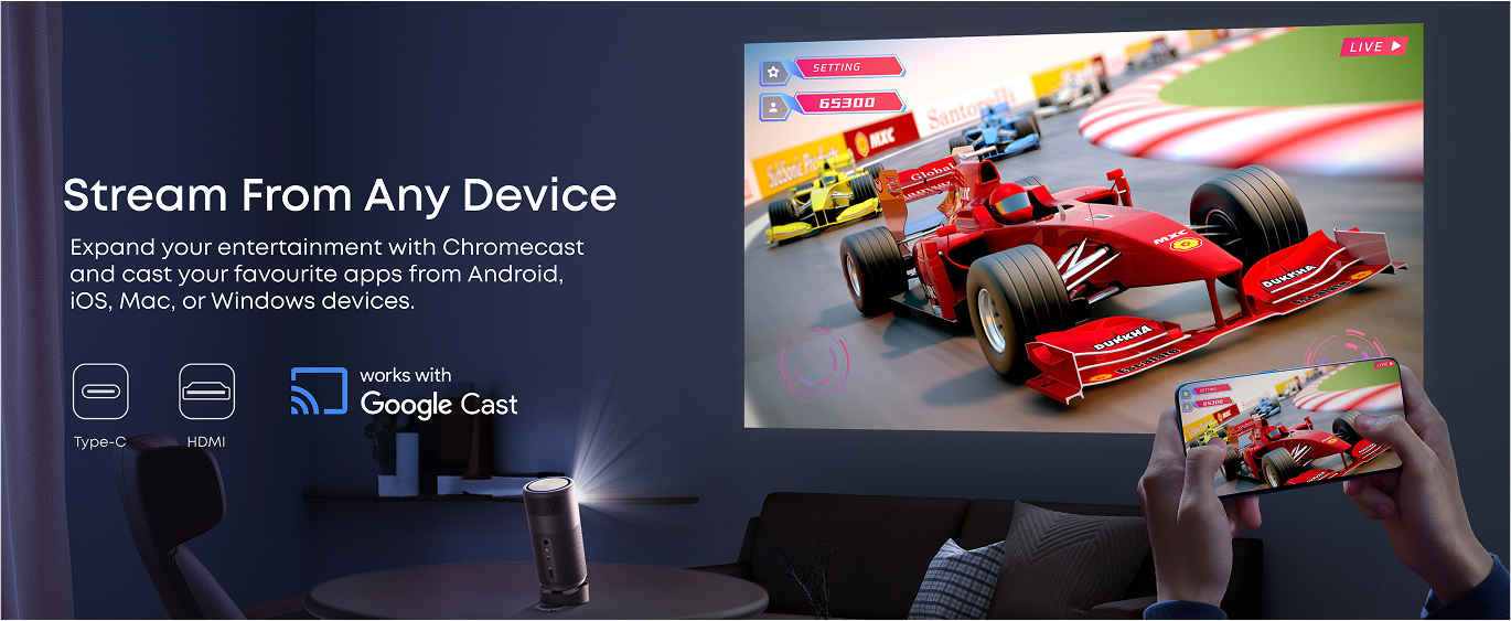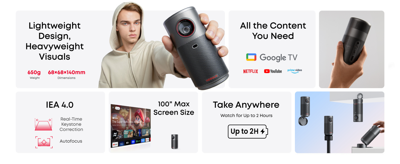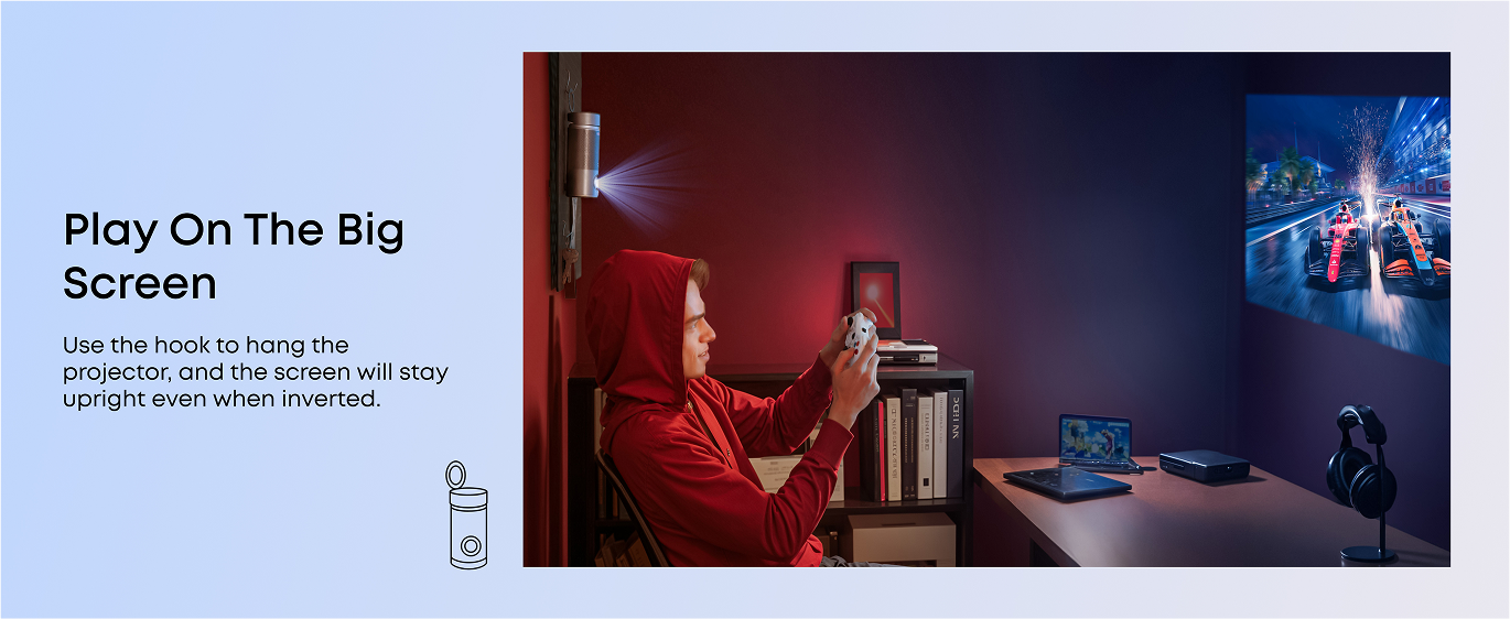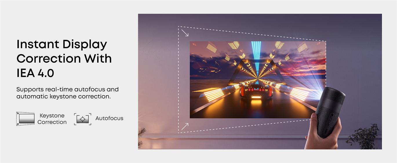 Display Technology: DLP 0.16 DMD Resolution: 720p Brightness: 150 ANSI Lumens Lamp Life: 30,000 hrs Focus Adjustment: AutoProtection Mode: Front / Rear / Front Ceiling / Rear Ceiling Keystone Correction: Auto (Vertical 40°), Auto (Horizontal 40°) Interface” HDMI 2.1 / USB-C |