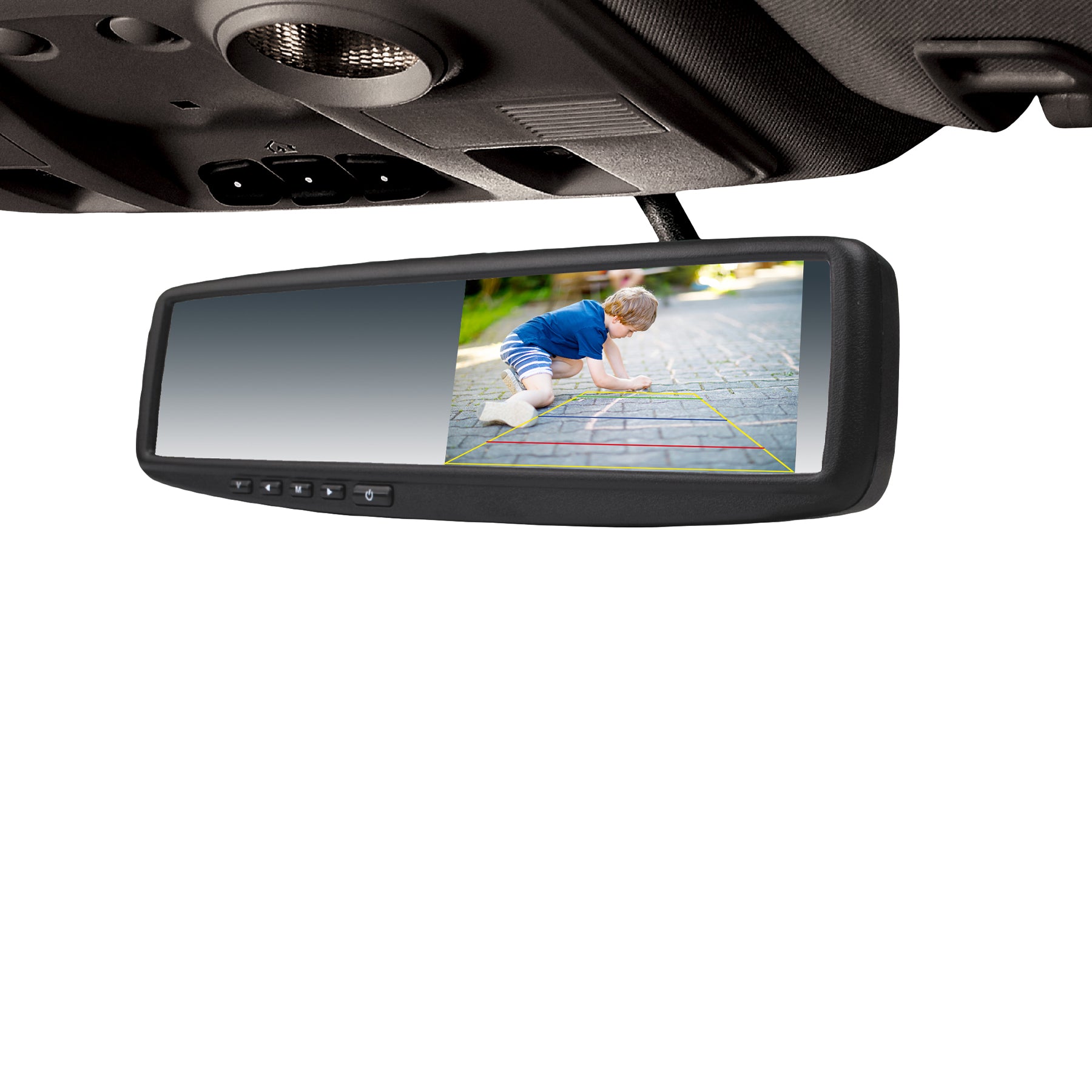 The MCPK-43BG Mirror & Mini Camera Pack enhances your driving experience with a mirror monitor and a rear camera for safe and easy reverse parking. It clips onto your existing rear-view mirror and features an embedded 4.3'' high-resolution LCD monitor.