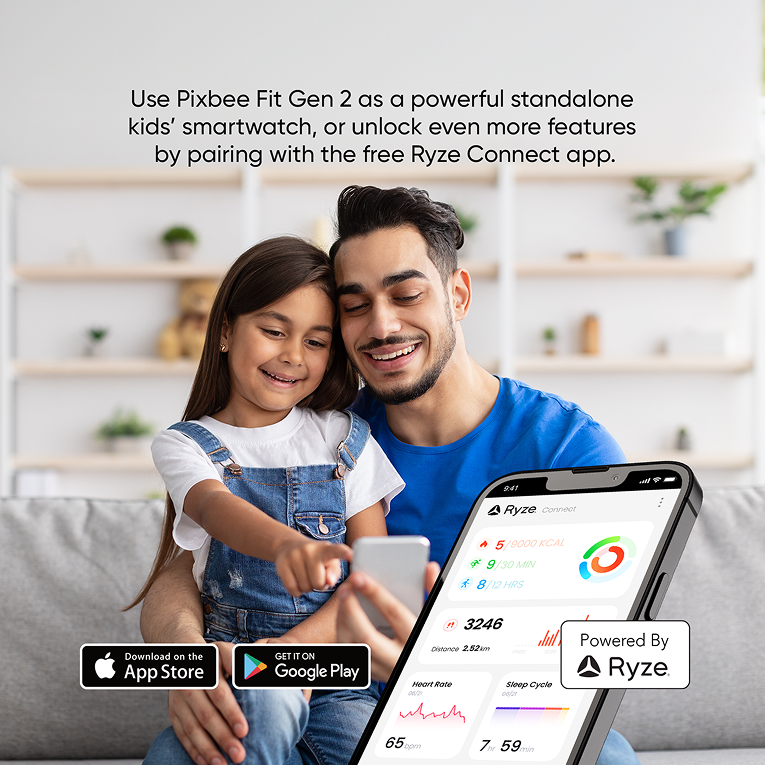 Use Pixbee Fit Gen 2 as a powerful standalone kids’ smartwatch, or unlock even more features by pairing with the free Ryze Connect app.