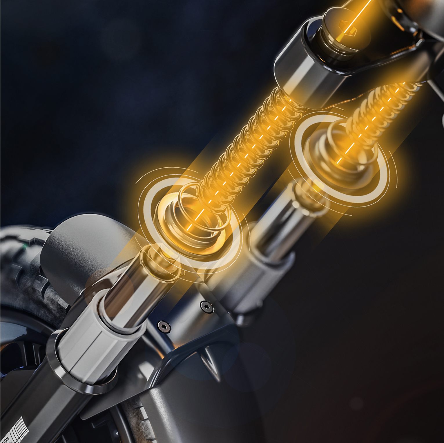 Our new, dual suspension system combines a front telescopic fork with adjustable rear twin shock absorbers for unrivalled riding comfort and control with low-maintenance reliability.