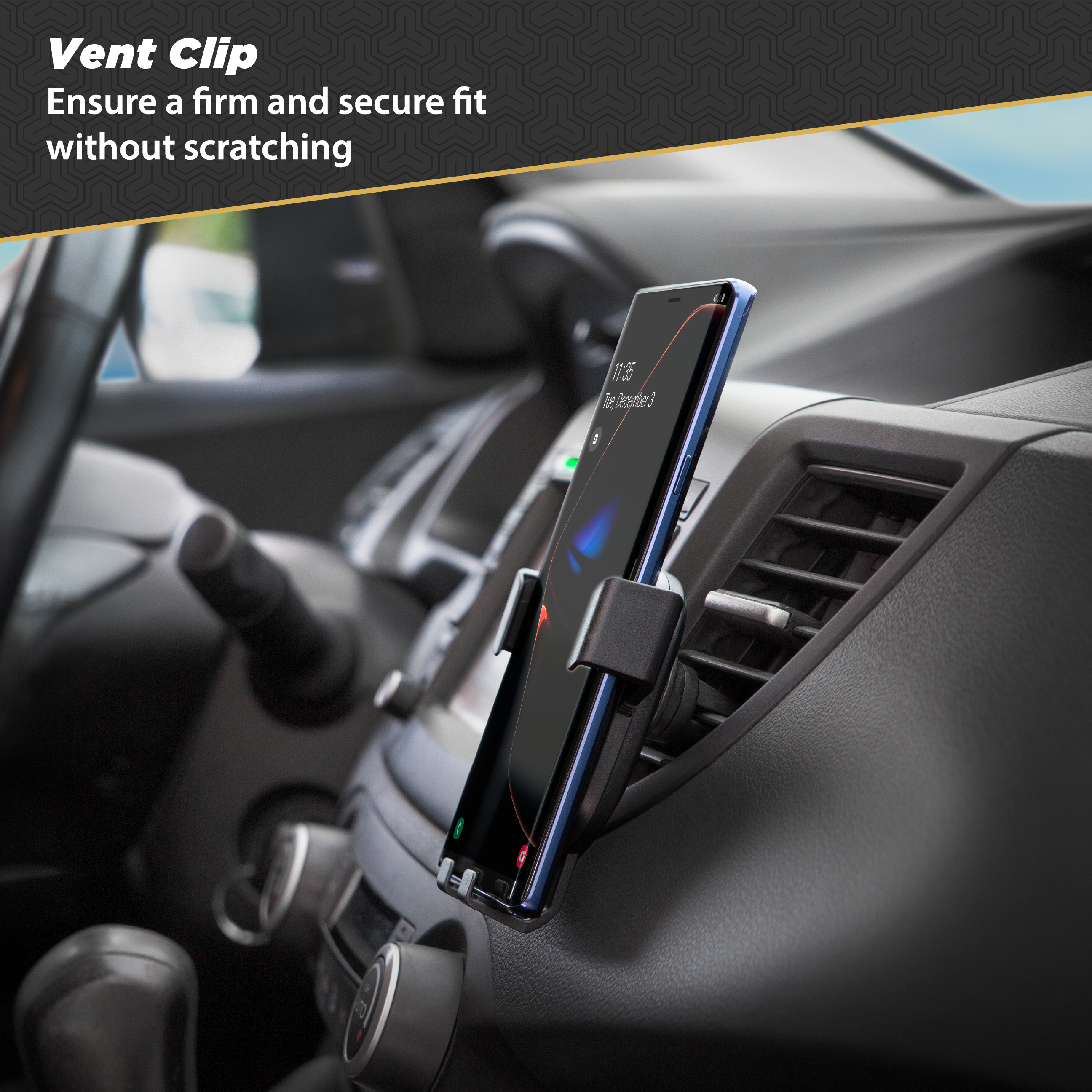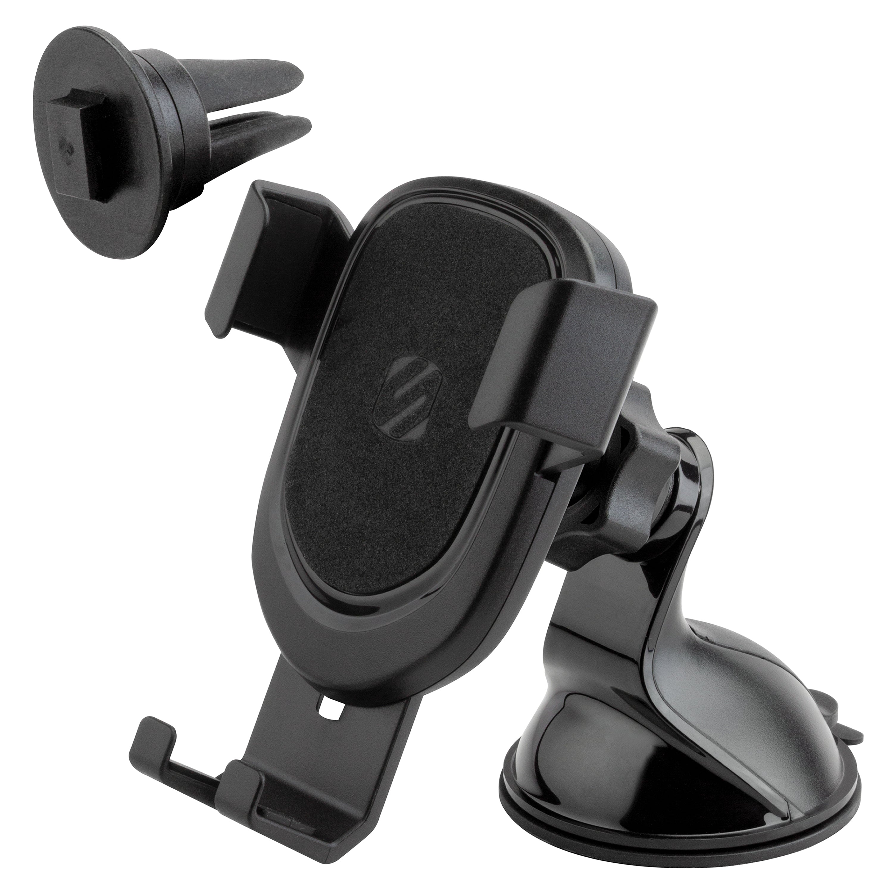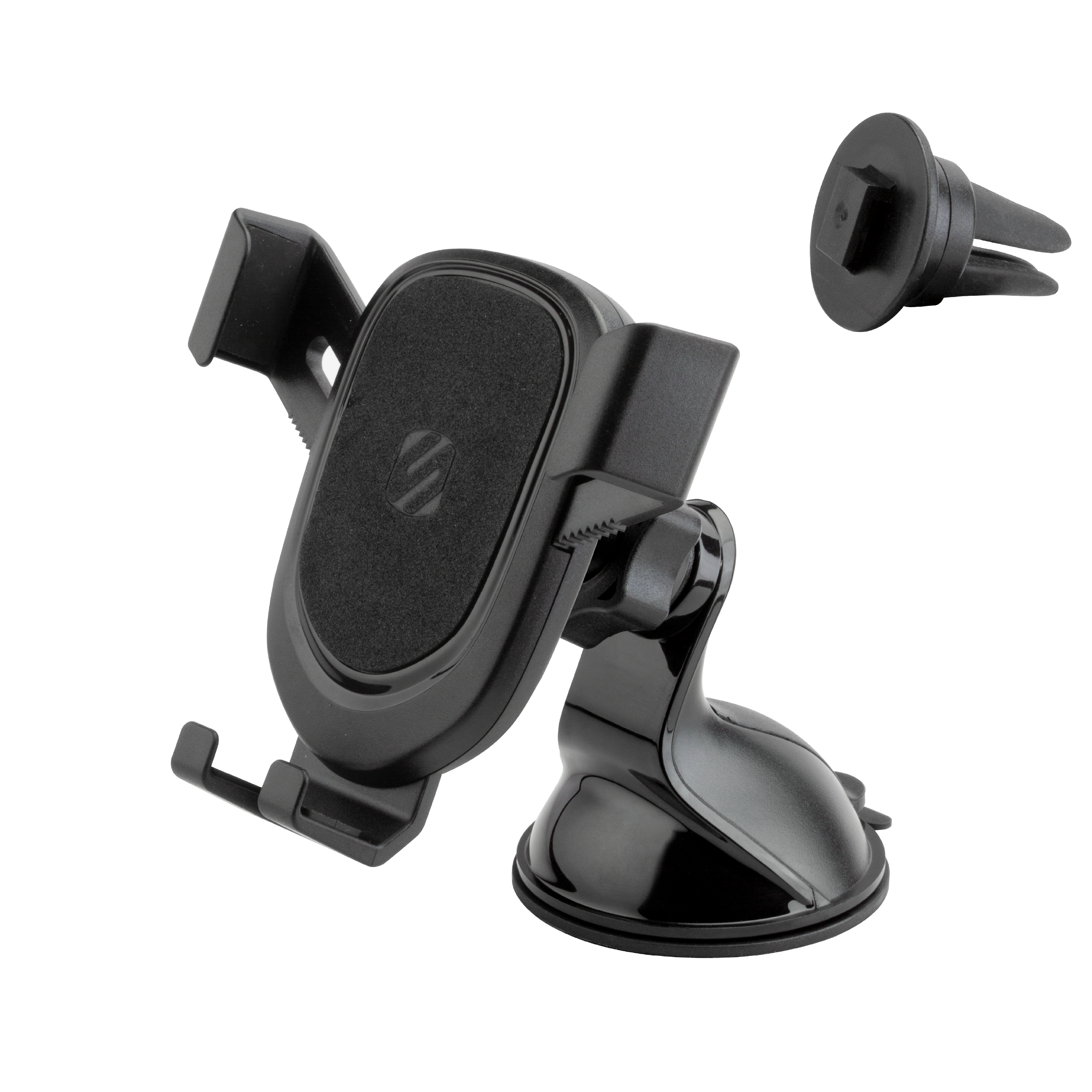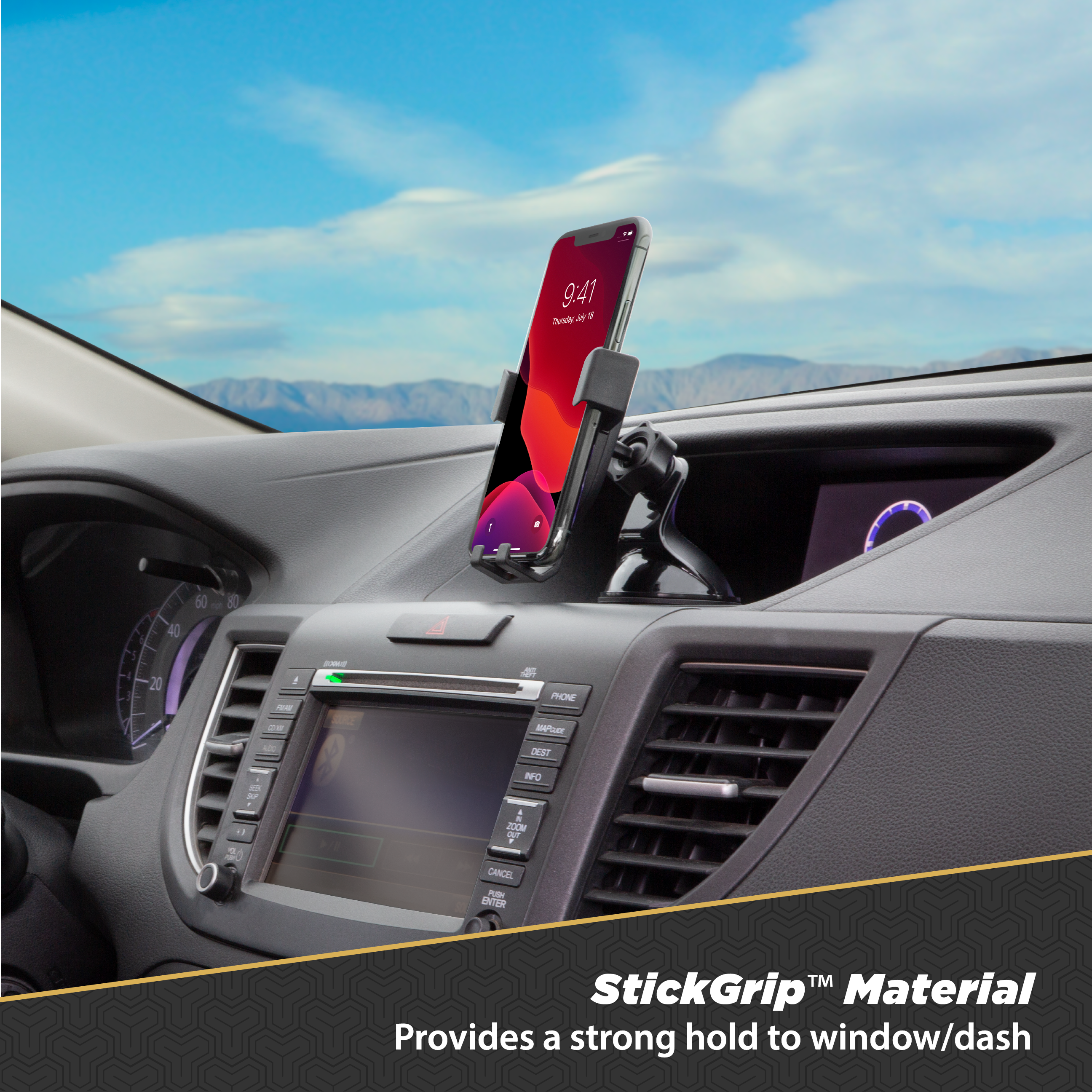 Versatile 3-in-1 mount suiting use on your vehicle’s window, dash, vent or any flat surface in the car, home or office. StickGrip Suction Cup base safely secures your mobile device. Unit is easy to move from one location to another. 360o rotating design and flexible neck let you view device from almost any angle. Just place your phone on top of the bottom feet to trigger the adjustable closing arms to secure your phone. The adjustable arms fit devices up to 3.5" wide