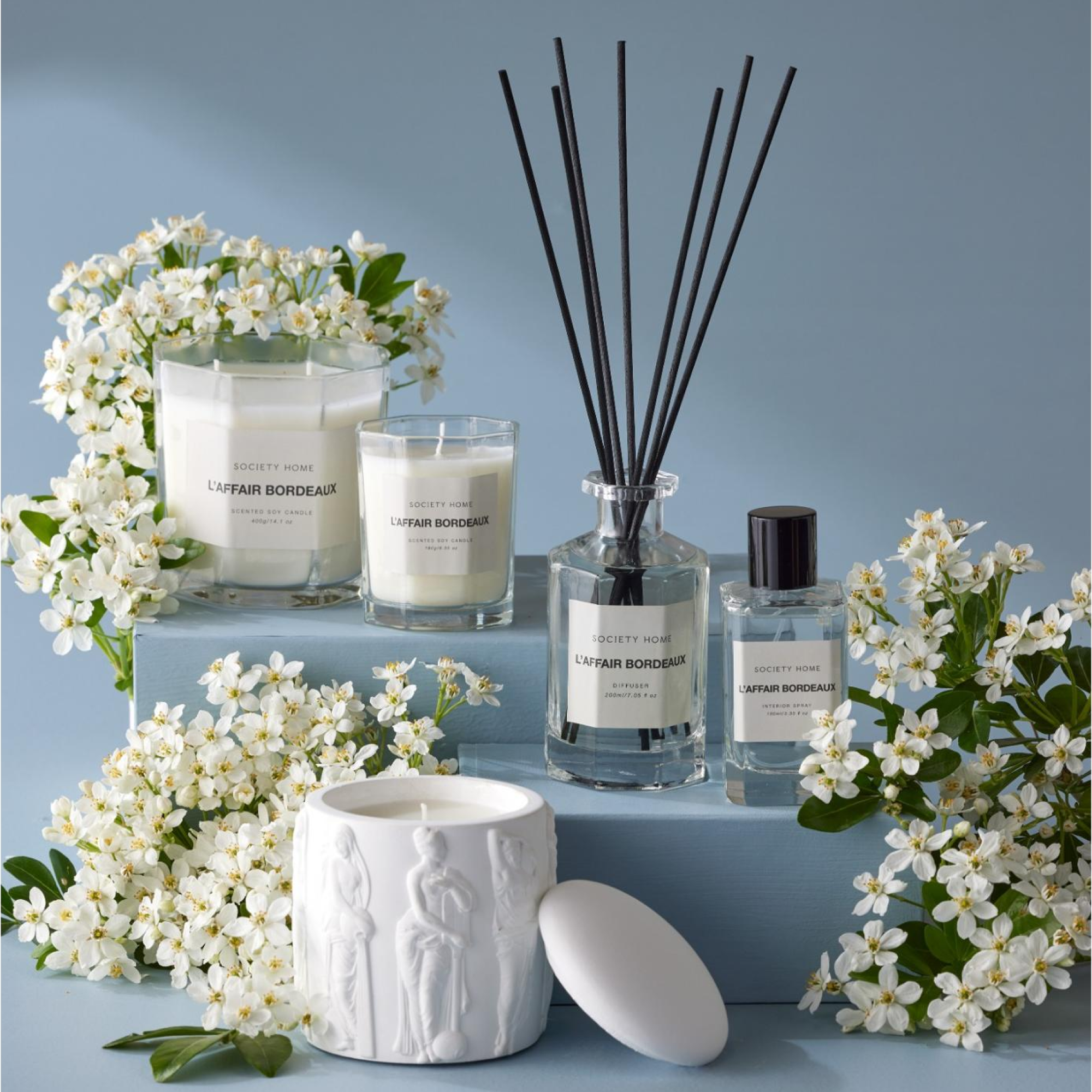 The beautiful white packaging and elegant glass bottle lends additional beauty when paired with the reeds.