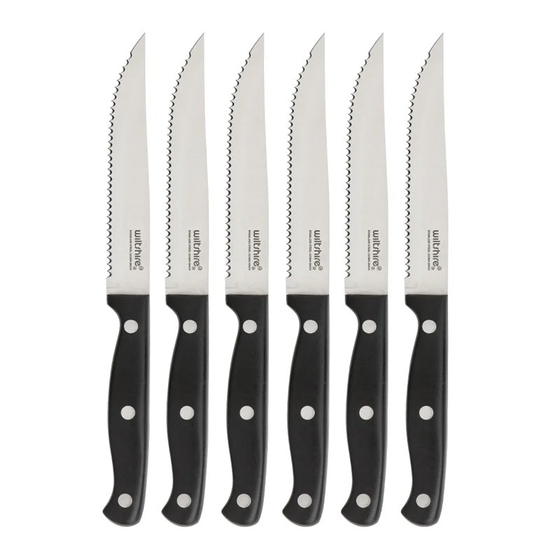 The Wiltshire Triple Rivet 6 Piece Steak Knife Set, with its comfortable ergonomic handles, has a voracious appetite for cutting through tough meat. And it's been cleverly designed with high-quality stainless steel for a lifetime of rust-resistant use, and a triple rivet handle construction for strength and durability.